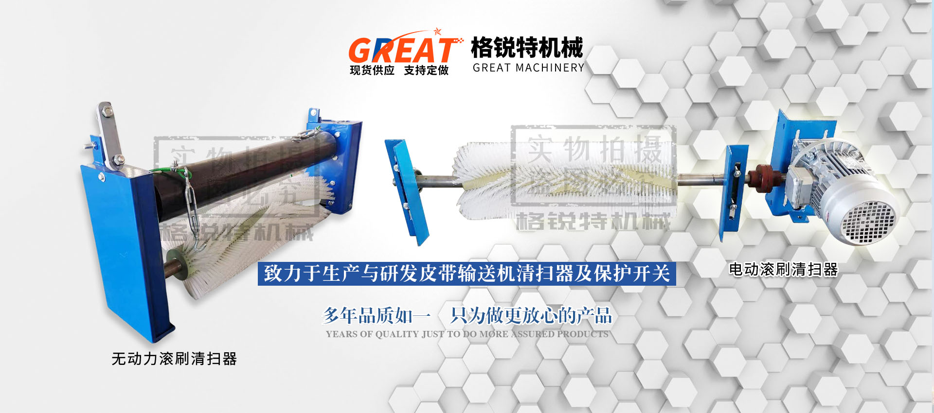 衡水格銳特機械科技有限公司常年致力于生產與研發皮帶輸送機清掃器及保護開關,其中主營聚氨酯清掃器,合金清掃器,電動滾刷清掃器,機械式滾刷清掃器,緩沖床,緩沖條,雙向拉繩開關,兩級跑偏開關,打滑檢測器,料流檢測器等保護開關,常年銷往各大水泥廠,煤礦廠,電廠,輸送機廠家,質量優越,價格實惠,望各大領導及同行來廠參觀指導,期待您的光臨?。?!